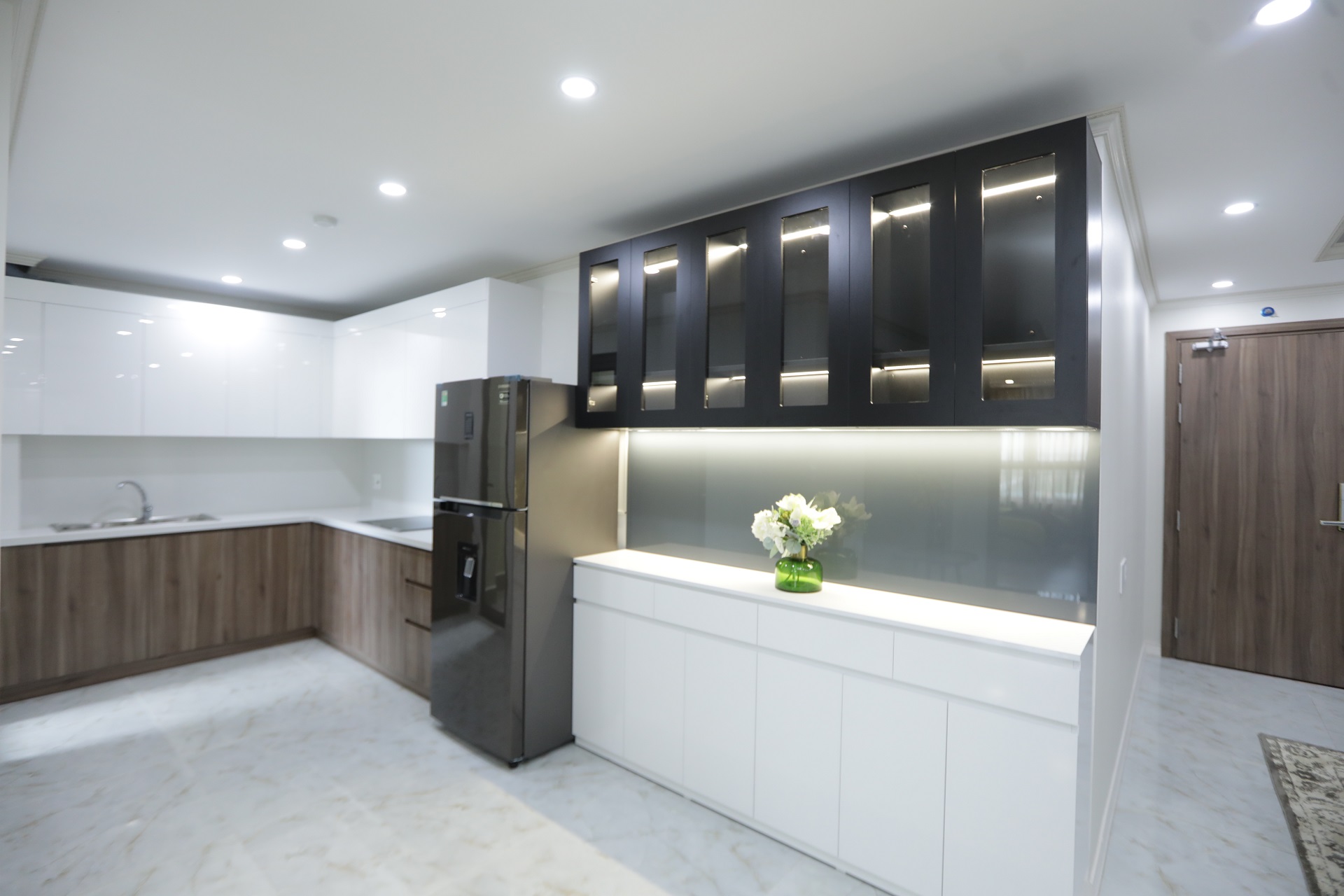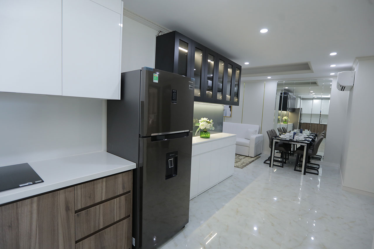 Một điểm đặc biệt là căn hộ được bàn giao đầy đủ khu vực bếp bao gồm: tủ bếp trên và dưới, bếp từ 3 vùng nấu, máy hút mùi, và bồn rửa chén. Phòng vệ sinh cũng được trang bị sẵn bình nước nóng. Dưới đây là hình ảnh thực tế từ căn hộ mẫu.