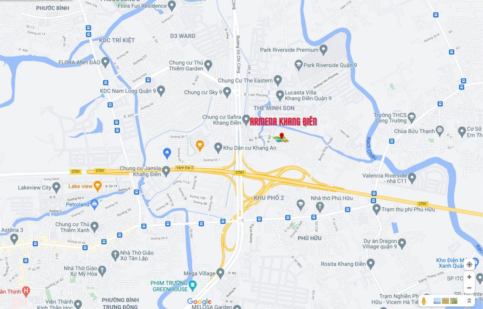 Khu biệt thự Armena Khang Điền thuộc phường Phú Hữu sở hữu vị trí mặt tiền đường Võ Chí Công, sát bên cao tốc Long Thành, sát bên quận 2. Cơ sở hạ tầng giao thông đã có sẵn, hiện hữu rất thuận tiện cho việc di chuyển đến các tiện ích và các vùng lân cận, là điểm sáng rõ rệt kết nối giao thông các vùng lân cận hiệu quả. Vị trí đắc địa hiếm có tại dự án được quy hoạch bài bản và tốt nhất tại Tp Hồ Chí Minh, đem lại cho Armena giá trị cao trong từng căn nhà vườn, biệt thự.